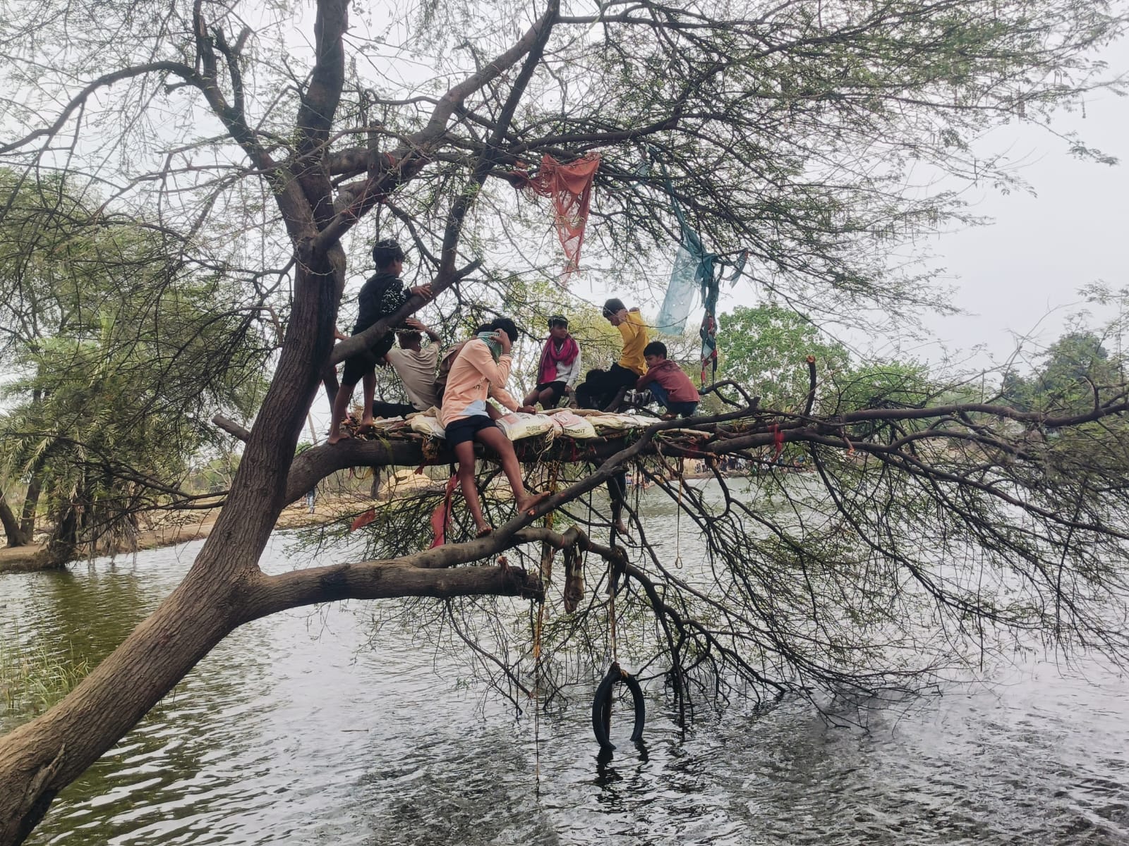भीषण गर्मी और चिलचिलाती धूप से राहत पाने के लिए, अंचल में लोग देशी जुगाड़ का इस्तेमाल कर रहे है। पेड़ पर मचान बनाकर रहने की प्रवृत्ति अक्सर गर्मी में देखने को मिलती है। कुछ इसी तरह का दृश्य ग्राम धाराशिव में देखा गया। जहंा पर कुछ युवकों के द्वारा तालाब के पार में लगे पेड़ में मचान बनाकर प्रकृति का आनंद ले रहे है। यह मचान युवको के लिए सुकुन की जगह होती है, युवक दोपहर की चिलचिलाती धूप में यहंा पर समय काटते है। इस वर्ष तेज गर्मी का कहर अपने चरम पर है। भीषण धूप की वजह से लोगों का जीवन अस्त-व्यस्त हो गया है। आलम यह है कि सुबह 9 बजे के बाद गर्मी अपना रौद्र रूप दिखा रही है जो देर शांम 6 बजे तक रहती है। युवा वर्ग तो किसी तरह प्रचंड गर्मी व जला देने वाली तेज धूप का सामना किसी पेड़ व ठंडी जगह जाकर समय काट लेते है। परन्तु सबसे बुरा हाल तो महिला, बच्चे और बुजूर्ग का है। गर्मी के कारण लोग रात-रात भर जग कर सुबह करते है। धूप निकलते ही गर्मी के कहर से सड़के सुनसान हो जा रही है। लोगों का मानना है कि इस बार सदी की सबसे अधिक भीषण गर्मी है। भीषण गर्मी की वजह से बाजार से लेकर ग्रामीण क्षेत्र के लोगों का जनजीवन पूरी तरह अस्त-व्यस्त हो चूका है।
