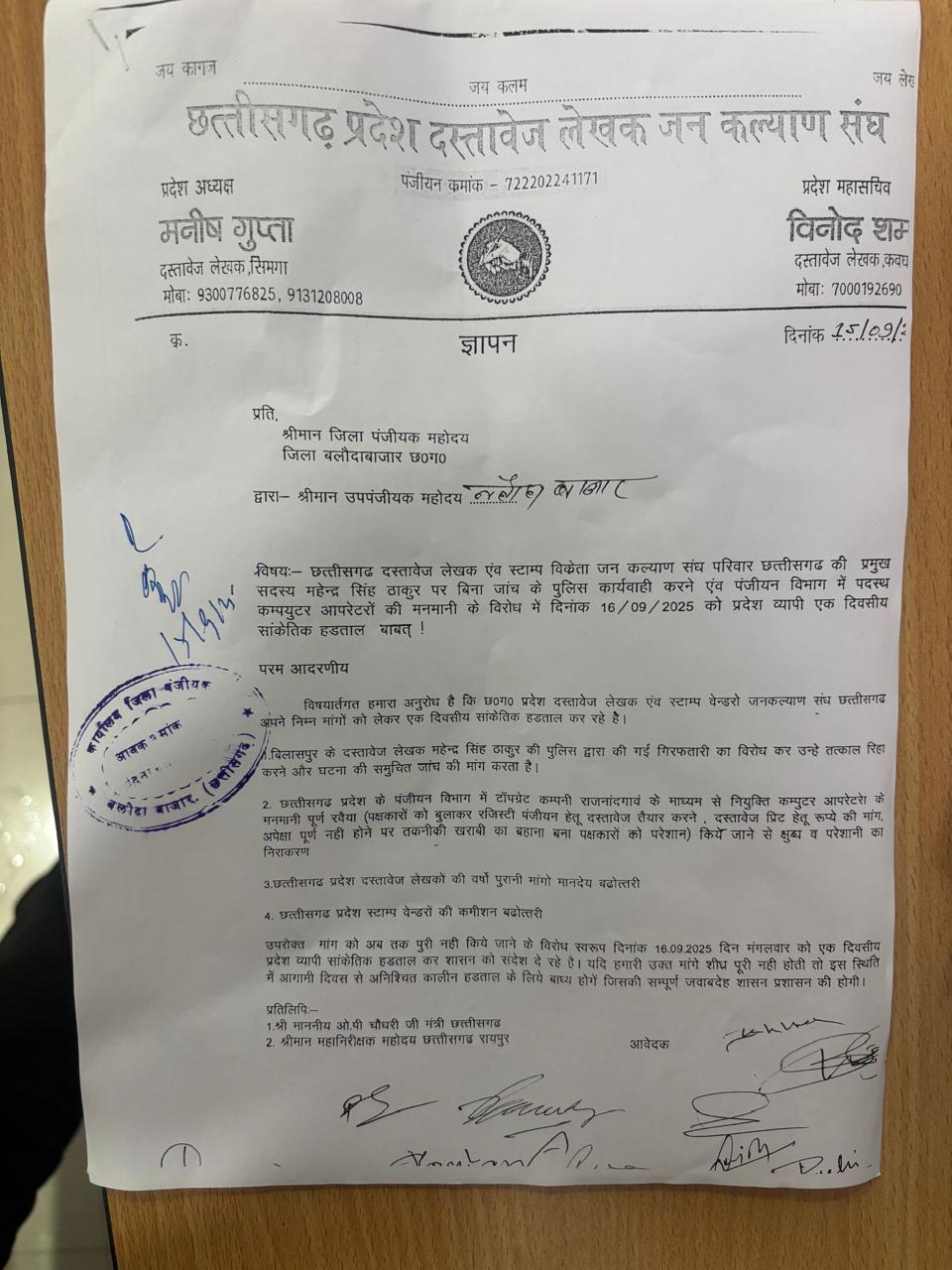 बिलासपुर के दस्तावेज लेखक महेन्द्र सिंह ठाकुर की गलत गिरफ्तारी के विरोध में दस्तावेज लेखक संघ और स्टाम्प वेन्टर संघ छत्तीसगढ़ का एक दिवसीय हड़ताल 16 सितम्बर को रखा गया है। इस कार्यवाही के विरोध में दस्तावेज लेखक संघ का पूरे छत्तीसगढ़ में एक दिवसीय सांकेतिक हड़ताल कार्यक्रम रखा है। जिनमें इसके द्वारा प्रमुख रूप से मांगे रखी है जिसमें प्रमुख रूप से दस्तावेज लेखक महेन्द्र सिंह ठाकुर को झूठे मामले में फंसाकर गलत ढंग से गिरफ्तारी की गई है, जिसका समुचित जांच की मांग की गई है। इसके अलावा दस्तावेज लेखक संघ ने अपनी पुरानी लंबित मांगों को पूरा करने का मांग भी शासन प्रशासन से मांगे किये है। उपरोक्त मांगों को यदि समय रहते पूरा नहीं किया जाता है तो संघ का अनिश्चितकालीन हड़ताल शुरू हो जायेगा। जिसका प्रमुख जवाबदार शासन-प्रशासन रहेंगे। उक्त जानकारी दस्तावेज लेखक संघ का डेनिस कुमार साहू बलौदाबाजार ने दी है।